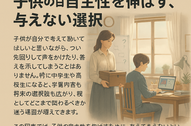 2026/01/30子供が自分で考えて動いてほしいと思いながら、つい先回りして声をかけたり、答えを示してしまうことはありませんか。特に中学生や高校生になると、学習内容も将来の選択肢も広がり、親としてどこまで関わるべきか迷う場面が増えてきます。手をかけるほど安心に感じる一方で、子供自身が考える機会を減らしていないかと不安になることもあるはずです。 この記事では、子供の自主性を伸ばすために、あえて与えないという関わり... -