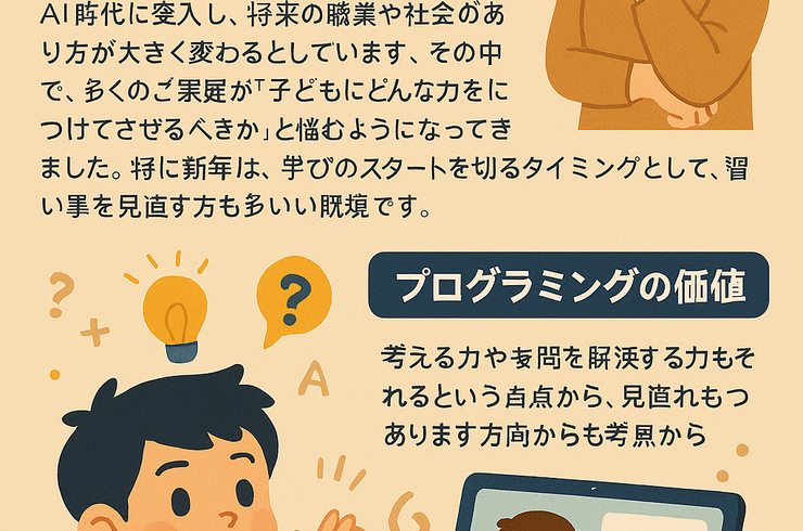 2026/02/06AI時代に突入し、将来の職業や社会の在り方が大きく変わろうとしています。その中で、多くのご家庭が「子どもにどんな力を身につけさせるべきか」と悩むようになってきました。特に新年度は、学びのスタートを切るタイミングとして、習い事を見直す方も多い時期です。 たとえば、「プログラミングを習わせてみようかな」と思ったとき、気になるのは本当に将来役立つのかどうか、そして、どのような力が育つのかという点ではない... -
