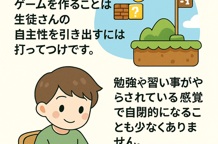 2025/10/27当教室では、生徒さんの自主性を引き出すにはどうすれば良いかについて考え、実践しています。プログラミングは、具体的なゲームを作りたいなど実現させたい目標や目的がある場合にはとても有効です。最近は、具体的な目標や目的は無く、習い事としてのプログラミングを期待して来校される生徒さんが多い気がします。実は、ゲームは自主性を引き出すにはうってつけです。まずゲームをやるためにはそのルールを理解しなければな... -