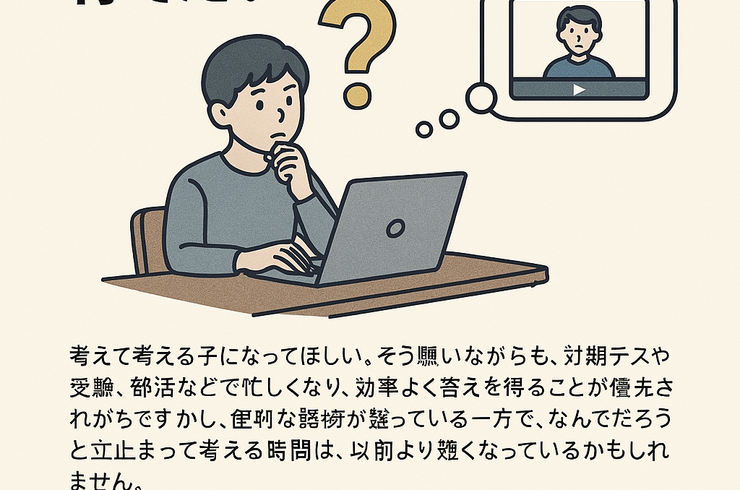 2026/02/15自分で考える子になってほしい。そう願いながらも、わからないことがあればすぐに検索し、動画で解説を見れば答えにたどり着ける時代です。便利な環境が整っている一方で、なんでだろうと立ち止まって考える時間は、以前より短くなっているかもしれません。 中学生や高校生になると、定期テストや受験、部活動などで忙しくなり、効率よく答えを得ることが優先されがちです。しかし、本当に身につけたいのは、答えそのものでは... -
