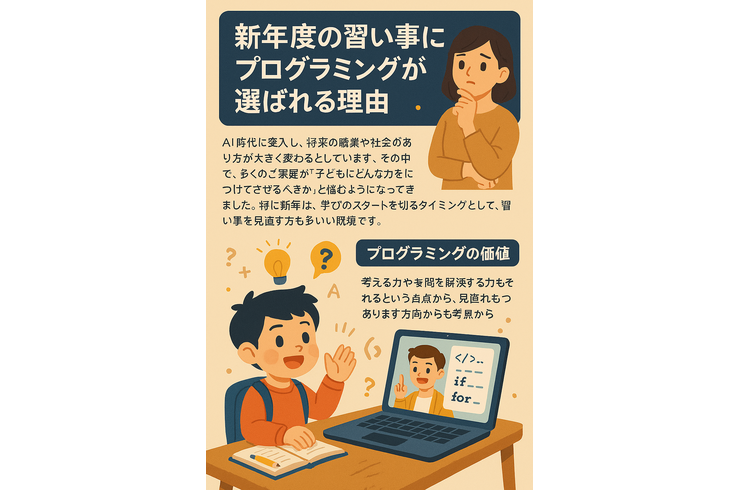 新年度を迎えるタイミングは、子どもにとっても保護者にとっても新しいことを始めるきっかけになりやすい時期です。習い事を見直す際に、近年注目されているのがプログラミング学習です。教科としての導入が進む中で、保護者の関心も高まり、「学びとしての価値」を重視して選ばれる傾向が強くなってきました。